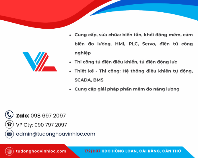 Tự động hóa Vĩnh Lộc – Đơn vị chuyên sâu trong lĩnh vực sửa chữa, bảo trì và cung cấp giải pháp thiết bị công nghiệp như biến tần, cảm biến, PLC, HMI… Với kinh nghiệm thực chiến trên hàng trăm nhà máy khắp miền Tây, chúng tôi cam kết mang đến dịch vụ kỹ thuật chất lượng – phản hồi nhanh – xử lý triệt để lỗi khó cho khách hàng trong các ngành sản xuất thực phẩm, bia, thủy sản, HVAC và năng lượng.